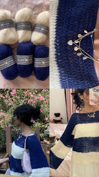 My sweater is made of fine weight (size 2) yarn that’s a mix of mohair, acrylic, and wool + 6 mm hook. I used around 300 grams of yarn (150 grams each of navy and white).